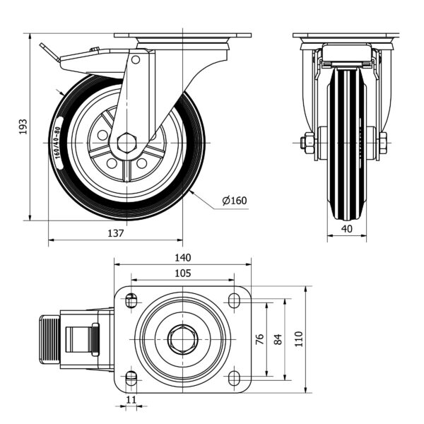 Rueda goma giratoria con freno Alex diametro 160 mm. TW0281