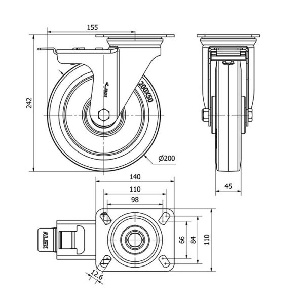 Rueda goma giratoria con freno Alex diametro 200 mm. 2-4470