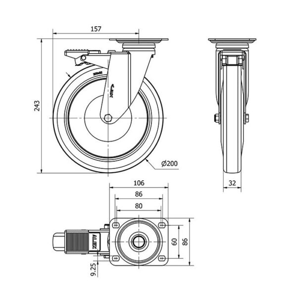 Rueda goma giratoria con freno Alex diametro 200 mm. modelo 2-1566