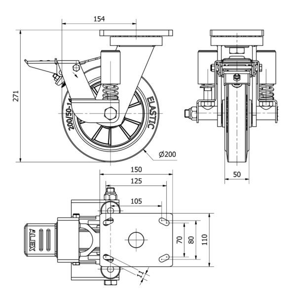 Rueda goma giratoria con freno Alex diametro 200 mm. modelo 2-4048