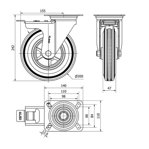 Rueda goma giratoria con freno Alex diametro 200 mm. modelo 2-4750
