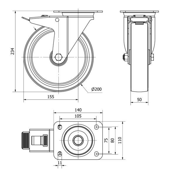 Rueda goma giratoria con freno Alex diametro 200 mm. modelo TW0307 EAN 8422202003078