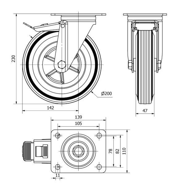 Rueda goma giratoria con freno Alex diametro 200 mm. TW0267