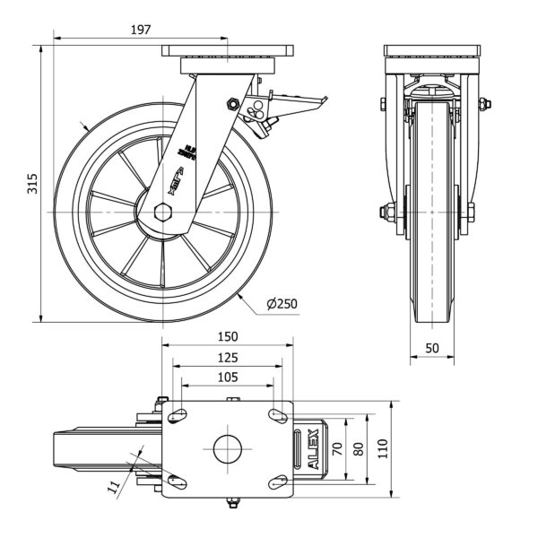 Rueda goma giratoria con freno Alex diametro 250 mm. modelo 2-2287