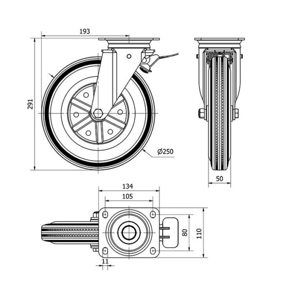 Rueda goma giratoria con freno Alex diametro 250 mm. modelo 2-4686