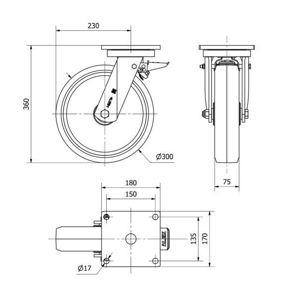 Rueda goma giratoria con freno Alex diametro 300 mm. modelo 2-3568