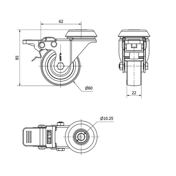 Rueda goma giratoria con freno Alex diametro 60 mm. modelo 2-5144