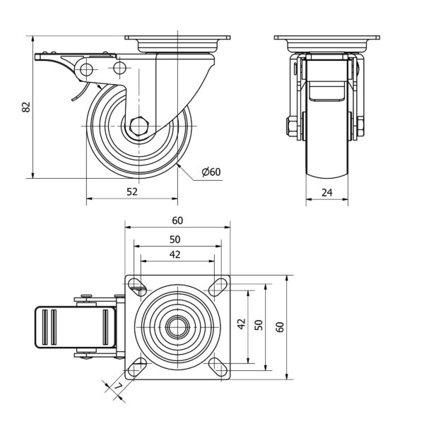 Rueda goma giratoria con freno Alex diametro 60 mm. modelo TW0238