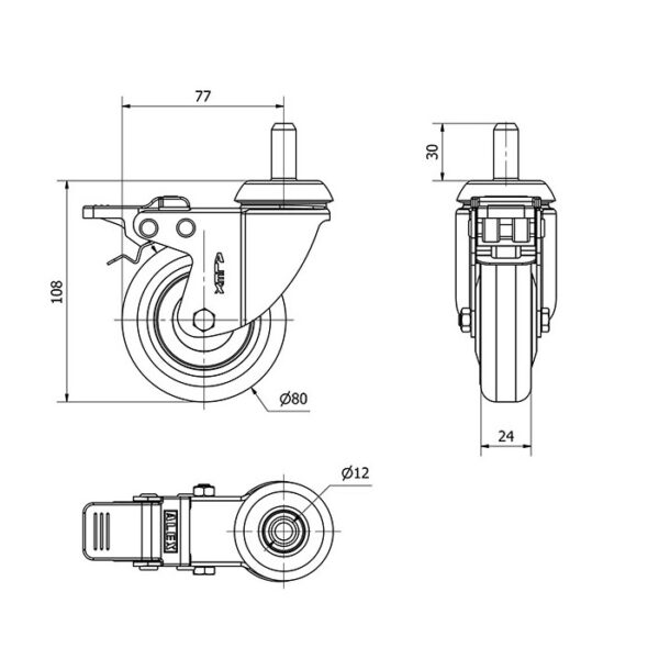 Rueda goma giratoria con freno Alex diametro 80 mm. modelo 2-1492