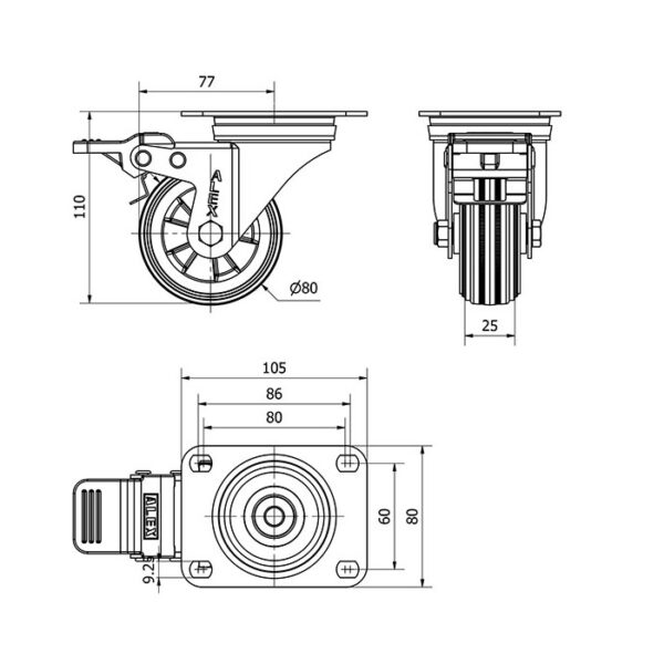 Rueda goma giratoria con freno Alex diametro 80 mm. modelo 2-2306