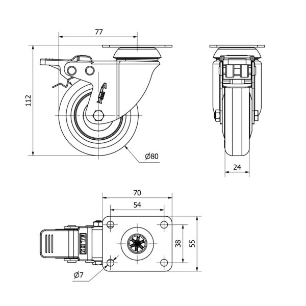 Rueda goma giratoria con freno Alex diametro 80 mm. modelo 2-3043