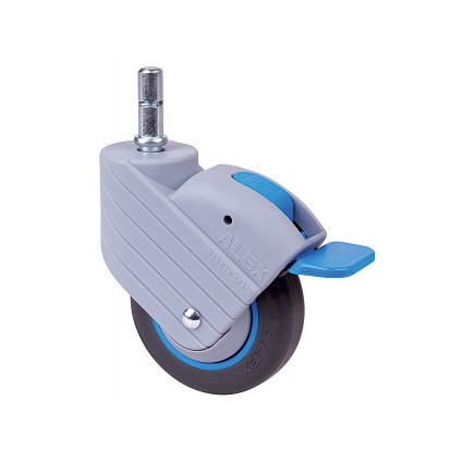 La serie de ruedas Alex HP-PGI son ruedas de poliamix y goma negra, indicadas para soportar cargas hasta 40 Kg. Se utilizan en expositores, muebles, taburetes, restauración, hospitales, útiles, portagoteros, mobiliario clínico sanitario, goteros y carros de limpieza. PGI: No rallan ni manchan el suelo. Aptas para todo tipo de superficies.