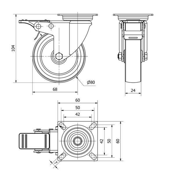 Rueda goma giratoria con freno Alex diametro 80 mm. modelo TW0239