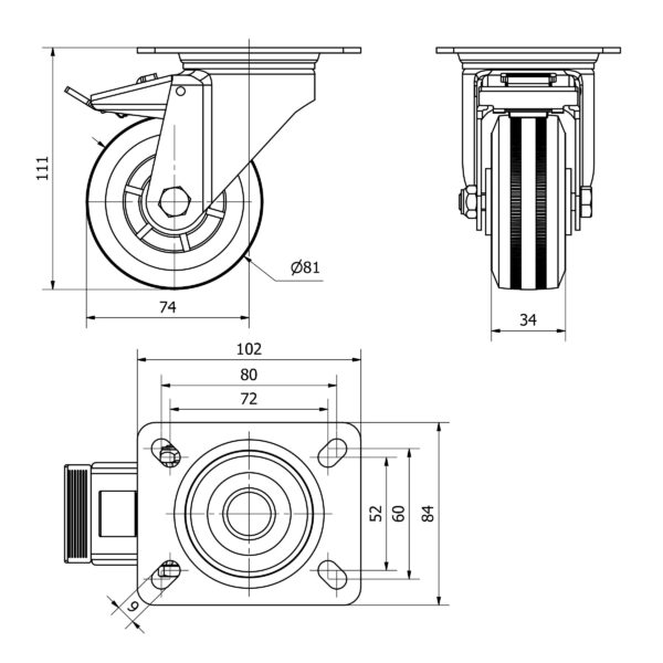 Rueda goma giratoria con freno Alex diametro 80 mm. modelo TW0263 EAN 8422202002637