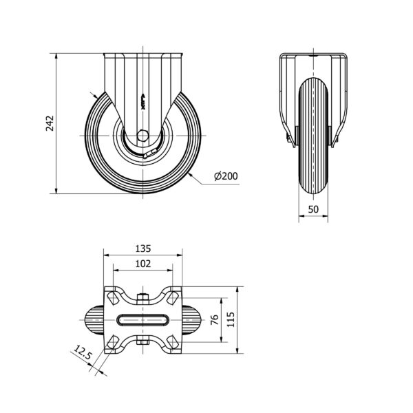Rueda neumatica fija Alex diametro 200 mm. modelo 4-1263 EAN 8422202412634 n nHOJA TECNICA n nLa serie de ruedas Alex ZV-RIL son ruedas color gris, con llanta metálica y cubierta neumática, indicadas para soportar cargas hasta 75 Kg. Se utilizan en carros de transporte y transporte de útiles. RIL: silenciosa y no deja huella.