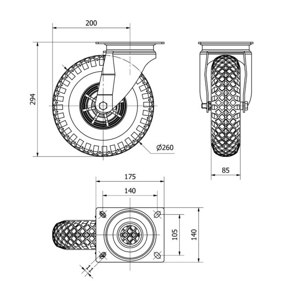 Rueda neumatica giratoria Alex diametro 260 mm. modelo 4-1626