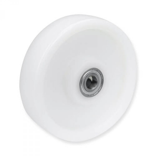 NY: Monobloque de Nylon (poliamida 6) de color blanco traslúcido. Se obtienen por inyección de nylon (poliamida 6). Banda de rodadura dura (70° Shore D). Ruedas de alta capacidad de carga a bajo coste (son las ruedas más populares de nuestra gama). Son ligeras de peso (densidad: 1,14), elásticas y resistentes a los golpes. Fáciles de mover, límpias, no ensucian los suelos. Son resistentes a la corrosión, a los agentes atmosféricos, al envejecimiento y al desgaste. Requieren un mínimo de lubrificación y mantenimiento. Su resistencia química es excelente y el material no se ve afectado por el agua, la sal, aceites, grasas, disolventes orgánicos, hidrocarburos, productos petrolíferos, jabones, detergentes, álcalis, leche, etc.