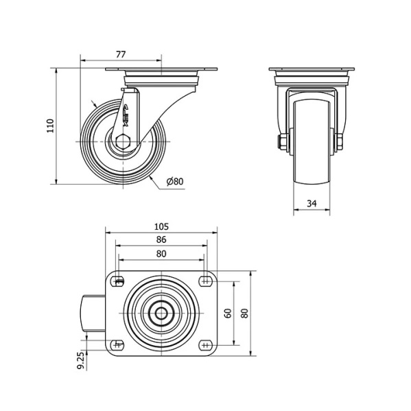 Rueda nylon giratoria Alex diametro 80 mm. 2-1316