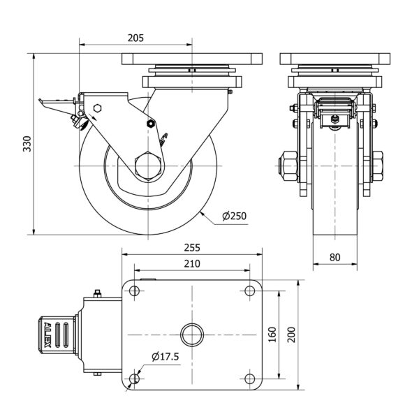 Rueda nylon giratoria con freno Alex diametro 250 mm. modelo 2-4255