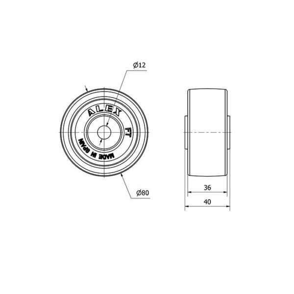 Rueda nylon-poliamida aro suelto Alex diametro 80 mm. modelo 4-0003 EAN 8422202400037 n nHOJA TECNICA n nLa serie de aros Alex FT son de nylon, extrafuertes, indicados para industrias alimentarias y químicas, no manchan el suelo y poseen alta resistencia a golpes y choques.