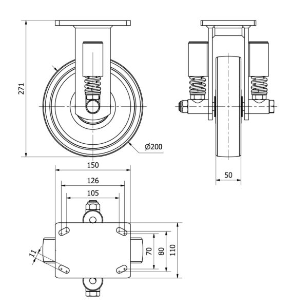 Las ruedas Alex serie HLS-FT son ruedas de nylon extrafuerte, indicadas para soportar altas cargas hasta 1.250 Kg. Con soporte de suspensión elástica, mediante incorporación de muelle muy resistente, ideal para suelos irregulares donde su amortiguación actúa. Se utilizan en útiles de transporte logístico, aéreas de exteriores, gradas móviles, plataformas elevadoras, carros de transporte, maquinaria pesada del sector de la construcción y grúas móviles. FT: indicadas para aplicaciones en industrias alimentarias, químicas y conserveras. No manchan el suelo. Extrafuertes.