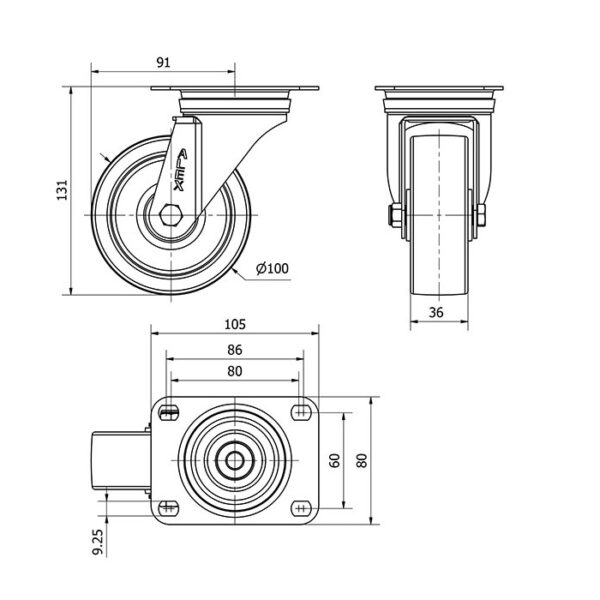 Rueda nylon-poliamida giratoria Alex diametro 100 mm. modelo 2-2683