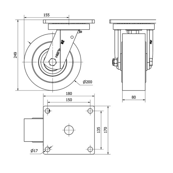 Rueda nylon-poliamida giratoria Alex diametro 200 mm. 2-0111
