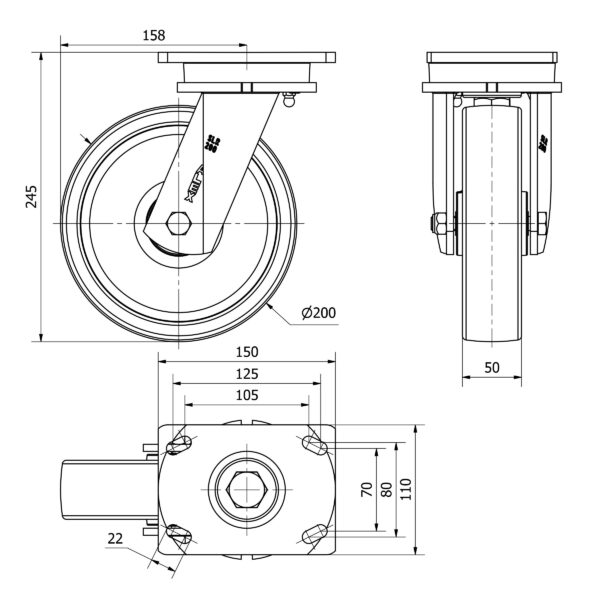 Rueda nylon-poliamida giratoria Alex diametro 200 mm. modelo 2-3671