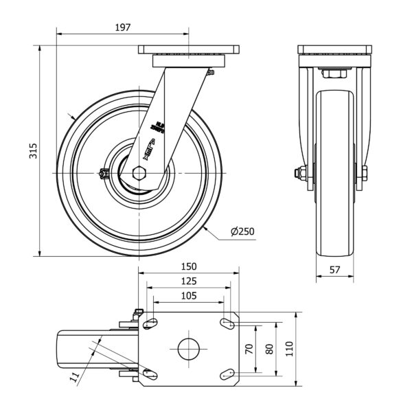 Rueda nylon-poliamida giratoria Alex diametro 250 mm. modelo 2-2298