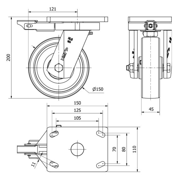 Rueda nylon-poliamida giratoria con bloqueo direccional Alex diametro 150 mm. modelo 2-3379
