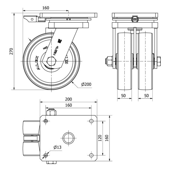 Rueda nylon-poliamida giratoria con bloqueo direccional Alex diametro 200 mm. modelo 2-3832