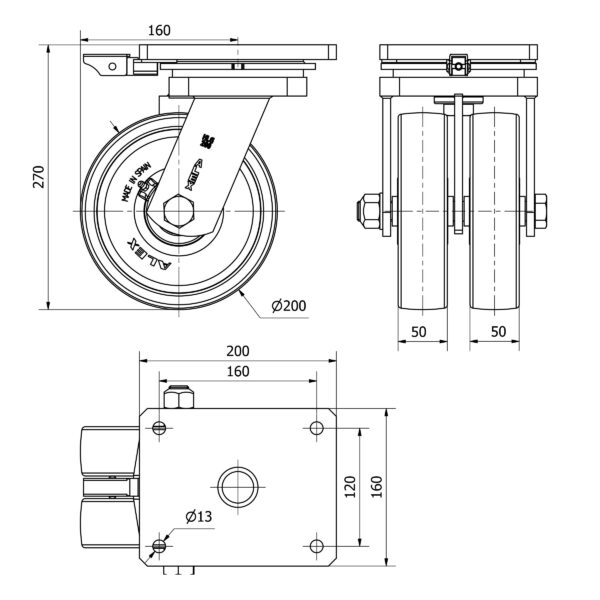Rueda nylon-poliamida giratoria con bloqueo direccional Alex diametro 200 mm. modelo 2-3835