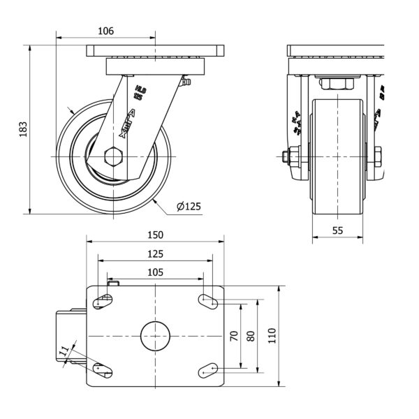 Las ruedas Alex serie HLB-NF son ruedas de nylon fundido extrafuerte de altas densidades, muy resistentes contra todo tipo de agentes químicos y al desgaste por abrasión, indicadas para soportar altas cargas de hasta 2,750 Kg. Se utilizan en útiles de transporte logístico, maquinaria pesada, carros de transporte, plataformas elevadoras, polideportivos, barredoras y pulidoras. NF: Rueda de muy alta capacidad de carga, con gran resistencia a golpes y choques. Extra pesada. Baja resistencia a la tracción.