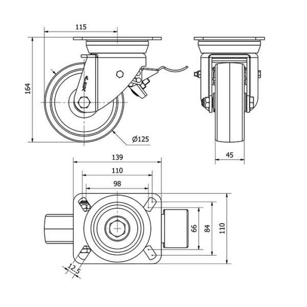 Rueda nylon-poliamida giratoria con freno Alex diametro 125 mm. modelo 2-1620