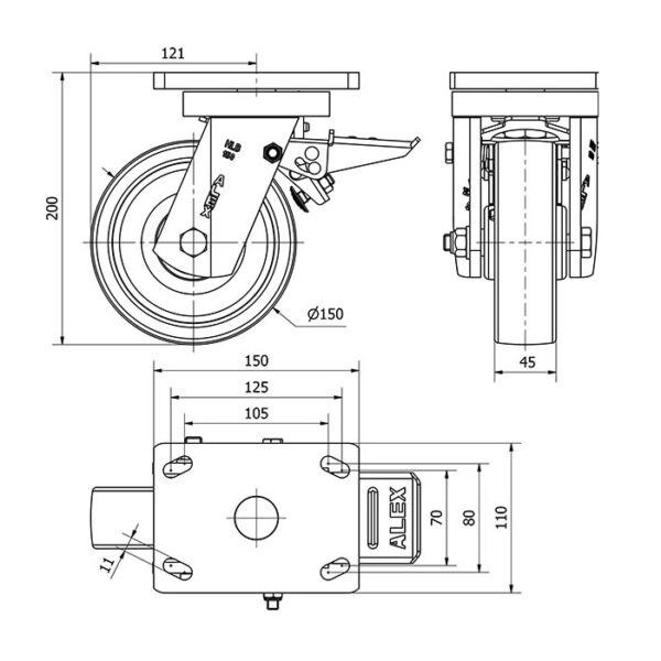 Rueda nylon-poliamida giratoria con freno Alex diametro 150 mm. modelo 2-1513