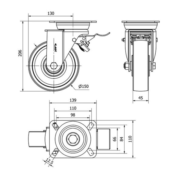 Rueda nylon-poliamida giratoria con freno Alex diametro 150 mm. modelo 2-1636