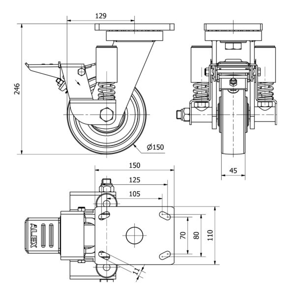 Rueda nylon-poliamida giratoria con freno Alex diametro 150 mm. modelo 2-4044