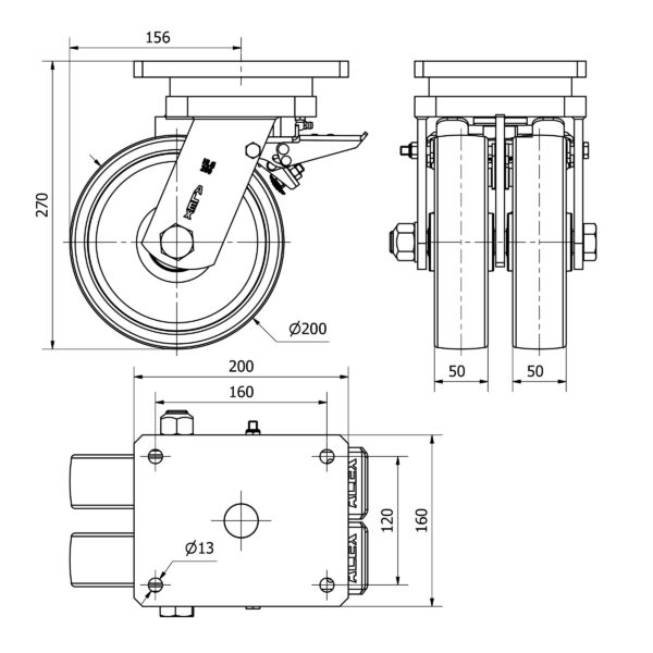 Rueda nylon-poliamida giratoria con freno Alex diametro 200 mm. modelo 2-3814