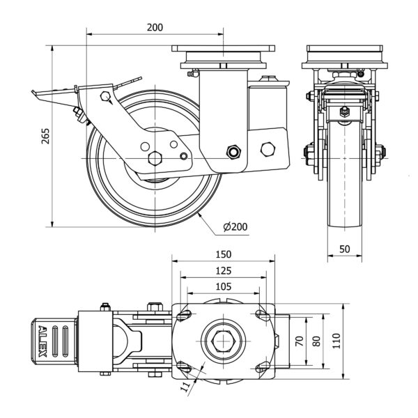 Rueda nylon-poliamida giratoria con freno Alex diametro 200 mm. modelo 2-3959