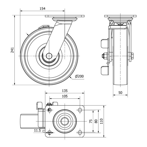 Rueda nylon-poliamida giratoria con freno Alex diametro 200 mm. modelo 4-1622