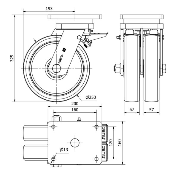 Rueda nylon-poliamida giratoria con freno Alex diametro 250 mm. modelo 2-3815