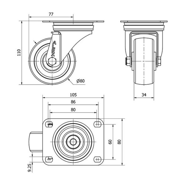 Rueda poliamix giratoria Alex diametro 80 mm. 2-2772