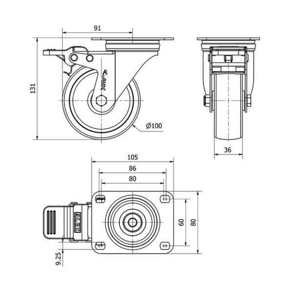 Rueda poliamix giratoria con freno Alex diametro 100 mm. modelo 2-1901