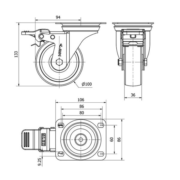 Rueda poliamix giratoria con freno Alex diametro 100 mm. modelo 2-2782