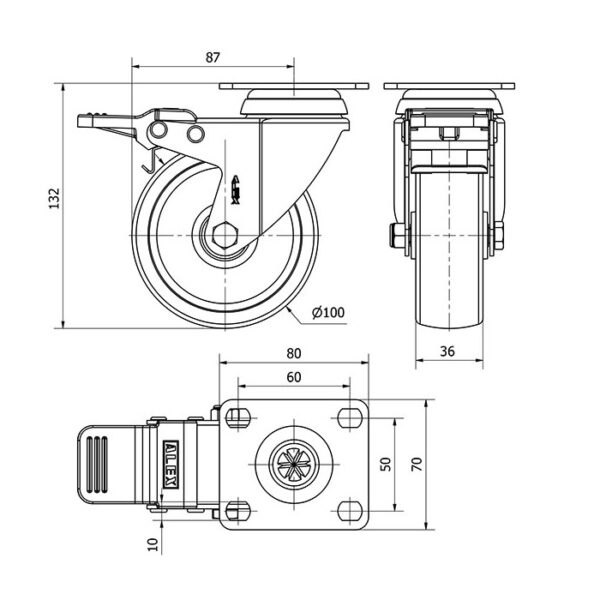 Rueda poliamix giratoria con freno Alex diametro 100 mm. modelo 2-4765 EAN 8422202247656