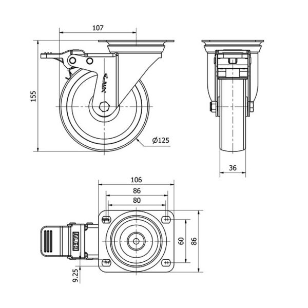 Rueda poliamix giratoria con freno Alex diametro 125 mm. modelo 2-1643