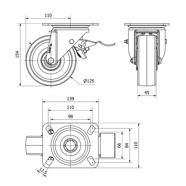 Rueda poliamix giratoria con freno Alex diametro 125 mm. modelo 2-2893
