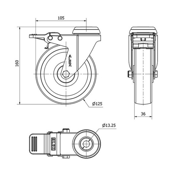 Rueda poliamix giratoria con freno Alex diametro 125 mm. modelo 2-4807