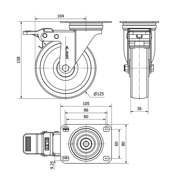 Rueda poliamix giratoria con freno Alex diametro 125 mm. modelo 2-4950