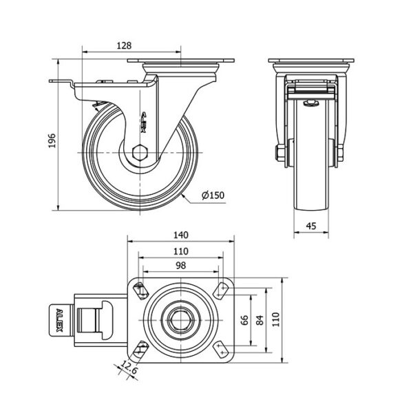 Rueda poliamix giratoria con freno Alex diametro 150 mm. modelo 2-0949